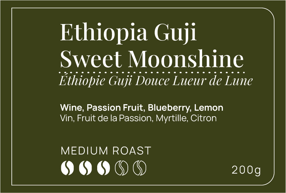 Discover the captivating charm of Ethiopia Guji Sweet Moonshine, a light roast coffee that dazzles with its intricate and bold flavors. Grown at 2200 meters in the lush Guji region and processed at the distinguished Uraga Station, this coffee is crafted with the innovative carbonic maceration method, enhancing its vibrant and layered profile.